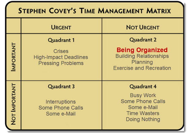 Stephen Covey’s main idea was that you want to focus on what's important instead of what's urgent, particularly those high value tasks which are often important but not urgent.